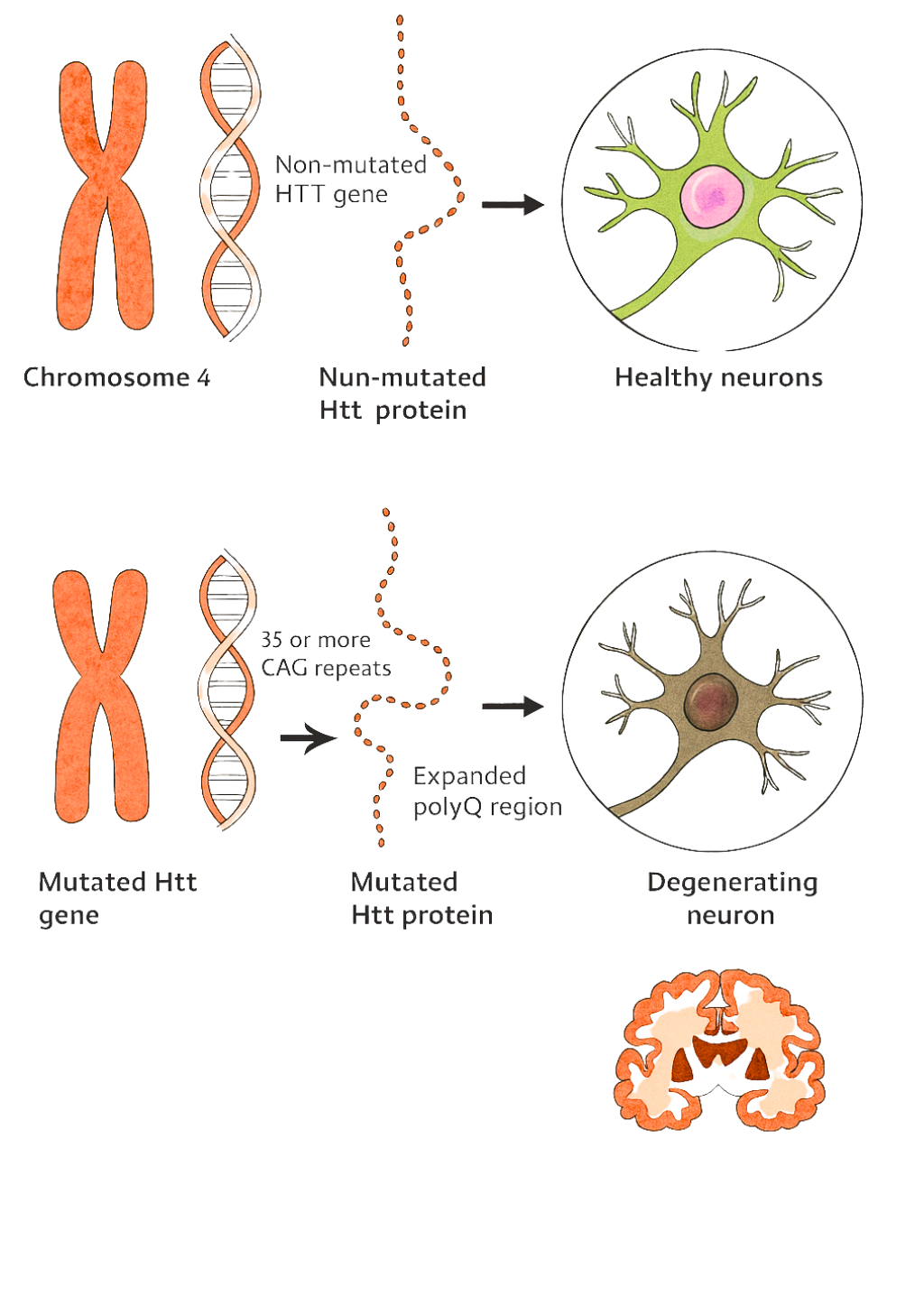The molecular basis of HD is well established. The disease is caused by expansion of a CAG trinucleotide repeat in exon 1 of the Huntingtin (HTT) gene, resulting in an abnormal huntingtin protein containing an expanded polyglutamine (polyQ) tract. This expanded polyQ region adopts aberrant conformations, leading to protein misfolding and accumulation into toxic oligomers and larger aggregates.