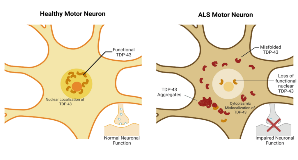 A defining molecular hallmark of ALS is the accumulation of misfolded TDP-43 protein in affected neurons – found in over 95% of patients, including both sporadic and genetic forms. This aberrant TDP-43 conformation disrupts protein homeostasis, contributing to neurotoxicity and disease progression.