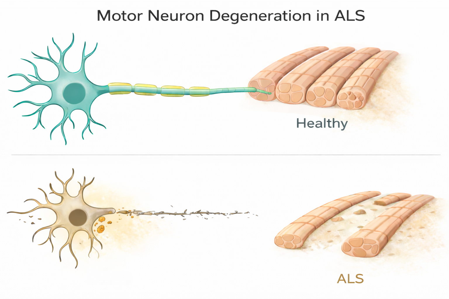 Amyotrophic lateral sclerosis (ALS) is a progressive neurodegenerative disease marked by the loss of motor neurons in the brain and spinal cord, ultimately leading to muscle weakness, paralysis, and respiratory failure. Despite its severity, effective disease-modifying therapies remain limited.