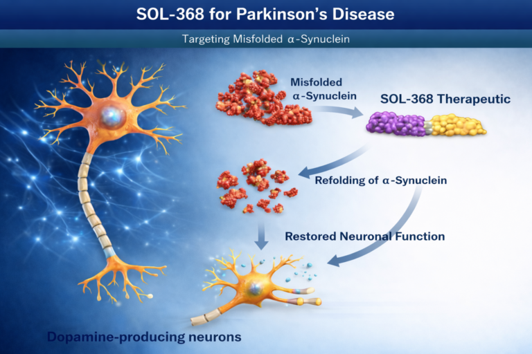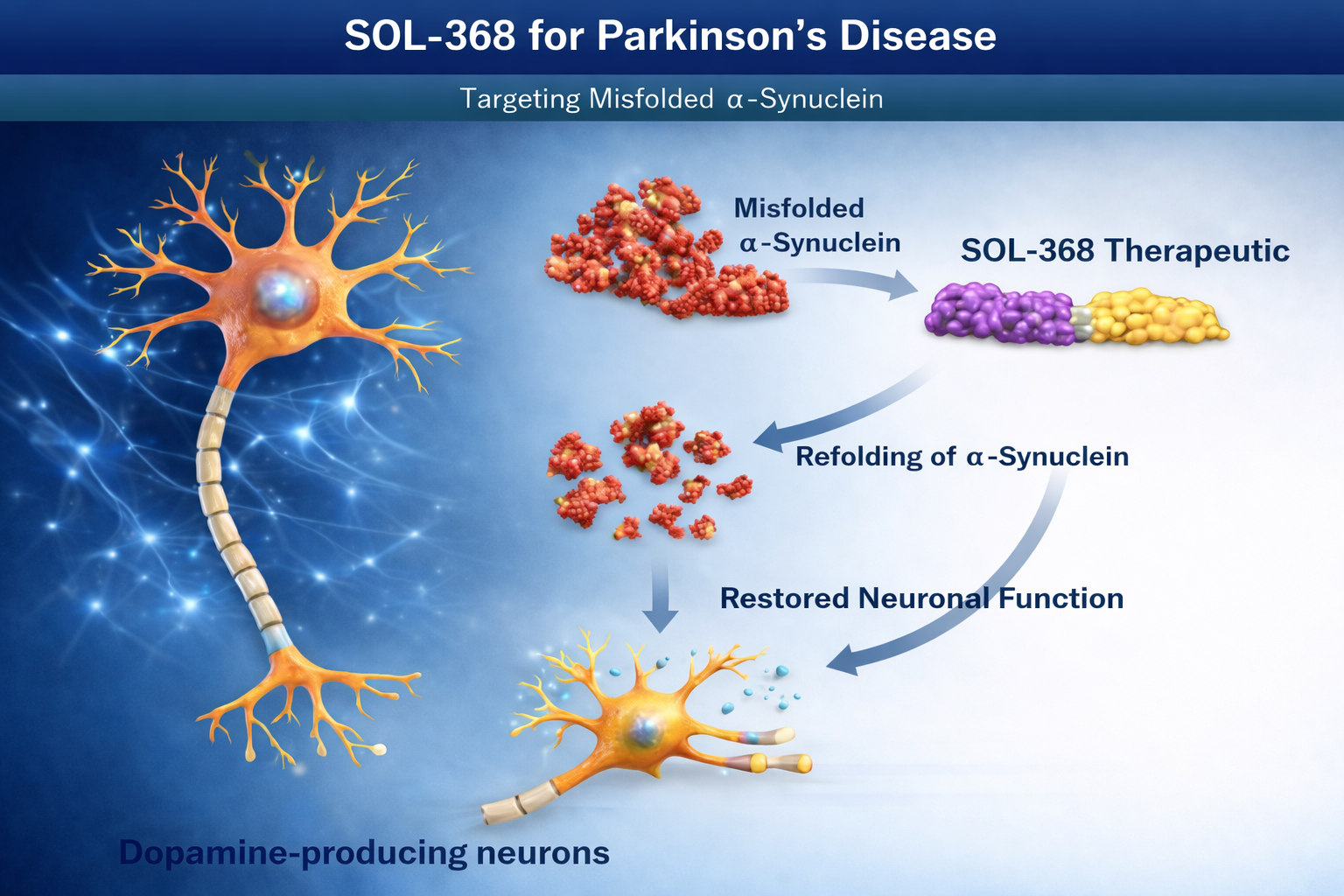 In Parkinson’s disease, misfolded alpha-synuclein accumulates within neurons, forming toxic oligomers and aggregates that disrupt cellular function and contribute to neurodegeneration. SOL-368 is designed to recognize these abnormal protein conformations while sparing normal alpha-synuclein, enabling selective engagement of pathogenic species.